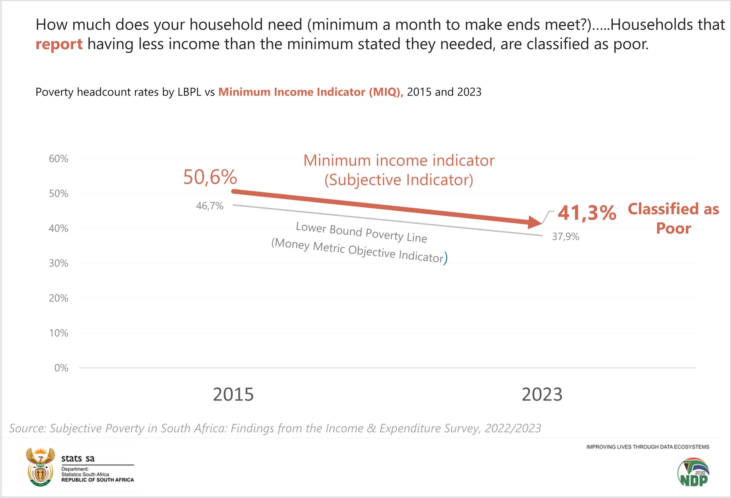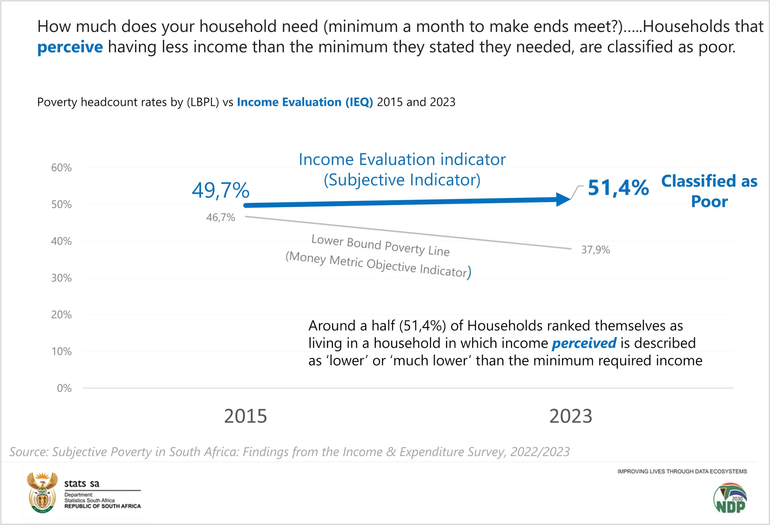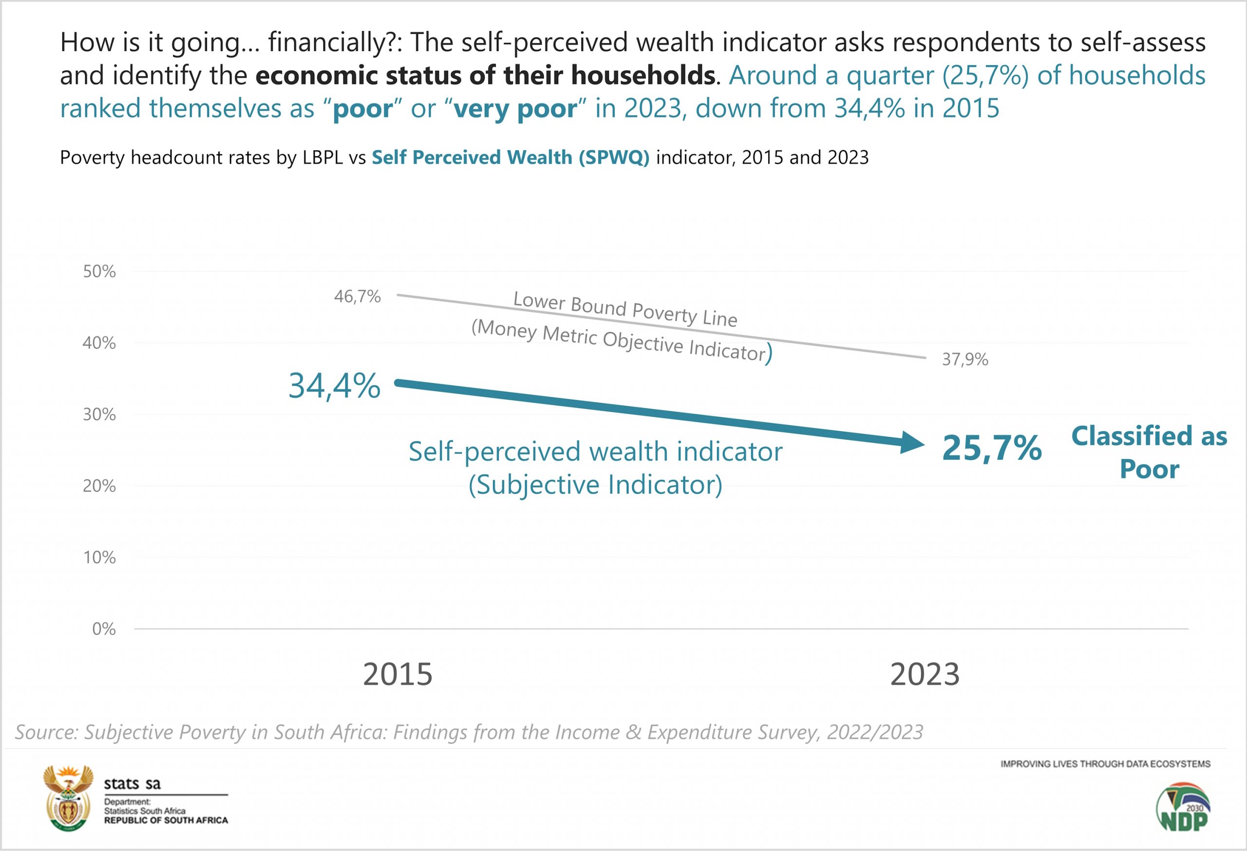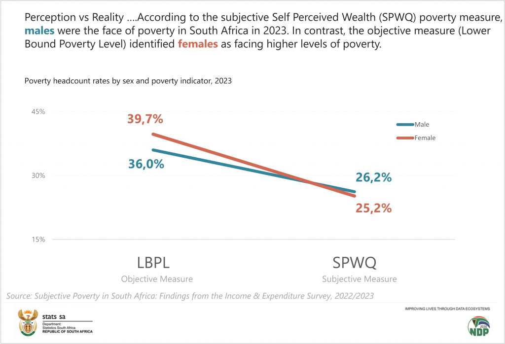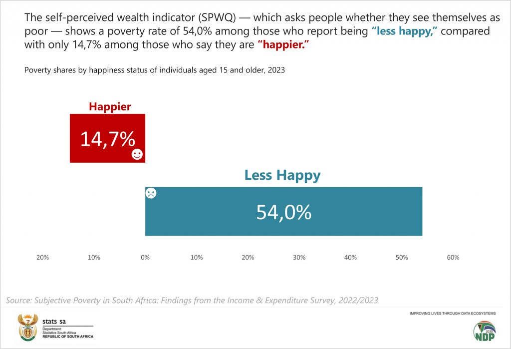 The latest findings show that fewer households and individuals in South Africa perceive themselves as poor than they did eight years ago. Two of the three measures used to capture how individuals perceive their financial status have improved. Using the self‑perceived wealth indicator — which reflects how individuals rate their own financial wellbeing — individuals who perceived themselves as poor dropped from 34,4% in 2015 to 25,7% in 2023.