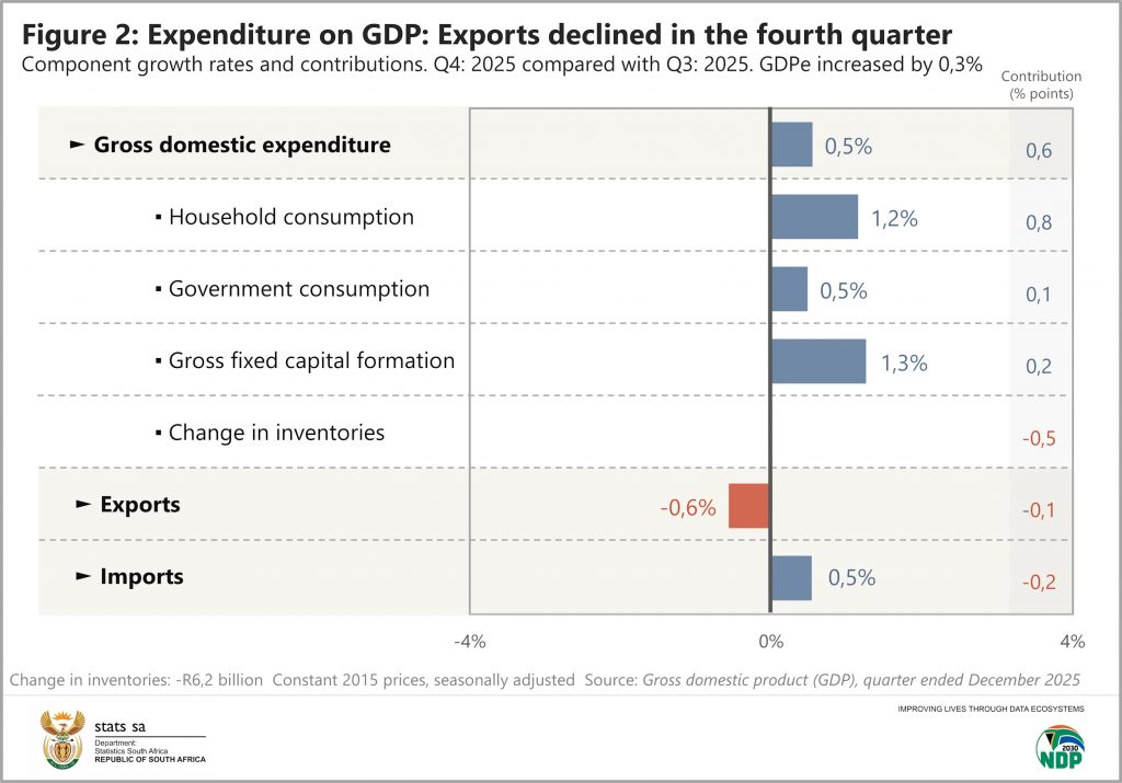 The South African economy recorded its fifth consecutive quarter of growth, expanding by 0,4% in the fourth quarter (October–December) of 2025.1 Finance, trade and personal services drove much of the upward momentum on the production (supply) side of the economy. A rise in household spending, gross fixed capital formation and government consumption lifted the expenditure (demand) side.