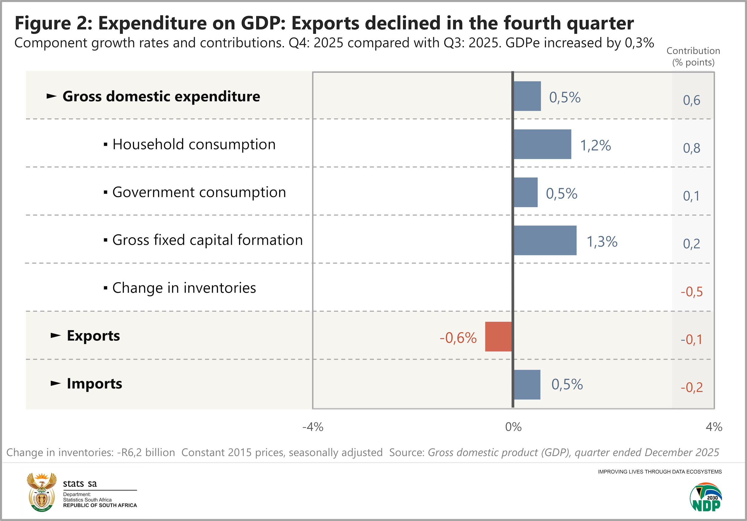 Not all was positive in the fourth quarter. Manufacturing was the largest negative contributor, shrinking by 0,6% and shaving 0,1 of a percentage point off GDP growth. The most significant downward pressure came from the automotive division; wood, paper & publishing; and food & beverages.