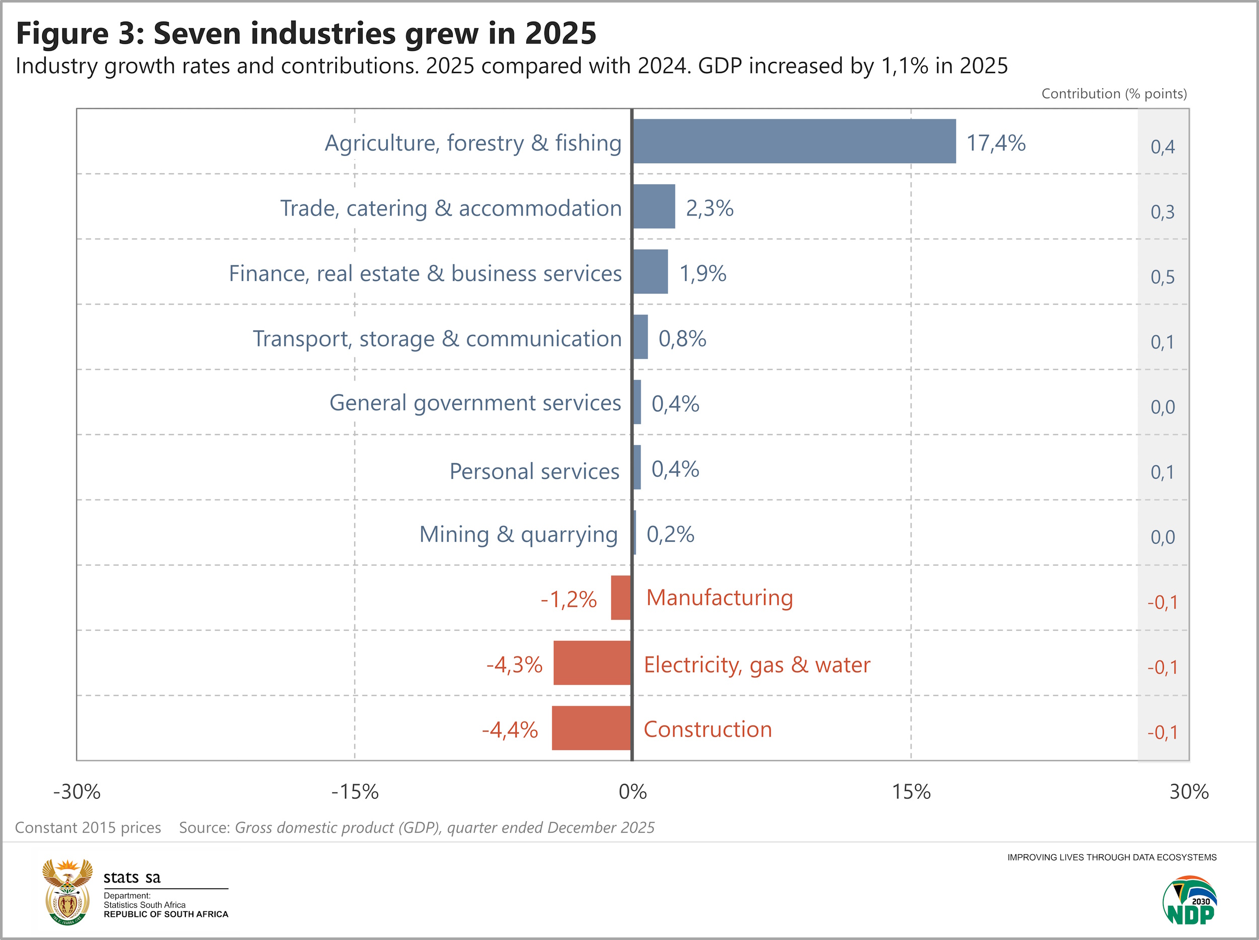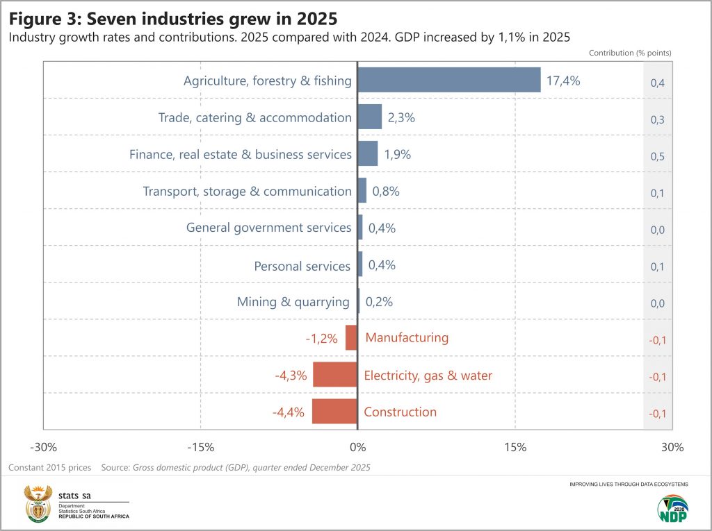 The GDP estimates for the fourth quarter conclude the results for the calendar year. Real GDP expanded by 1,1% in 2025, led by growth in finance, real estate & business services; agriculture; and trade, catering & accommodation (see Figure 3 below). This follows the growth of 0,8% and 0,5% in 2023 and 2024, respectively.