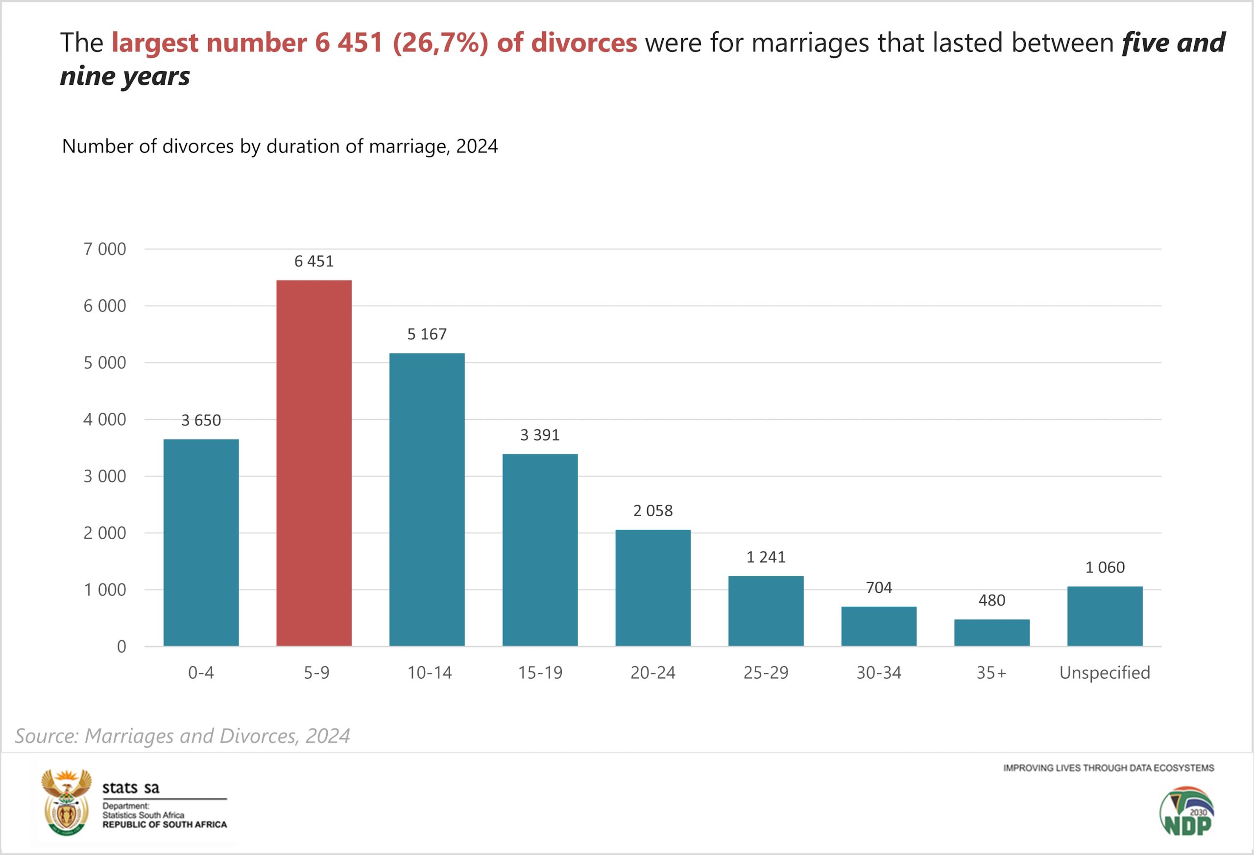 Marriage duration offers another perspective on the stability of relationships. The largest share of divorces—6 451 cases, or 26,7%—occurred in marriages that had lasted between five and nine years. This was followed by marriages of 10 to 14 years, which accounted for 5 167 divorces (21,3%). Another 3 650 divorces (15,1%) were granted to couples married for less than five years. Overall, four in every ten divorces granted in 2024—10 101 cases, representing 41,7%—involved marriages that had lasted less than a decade.