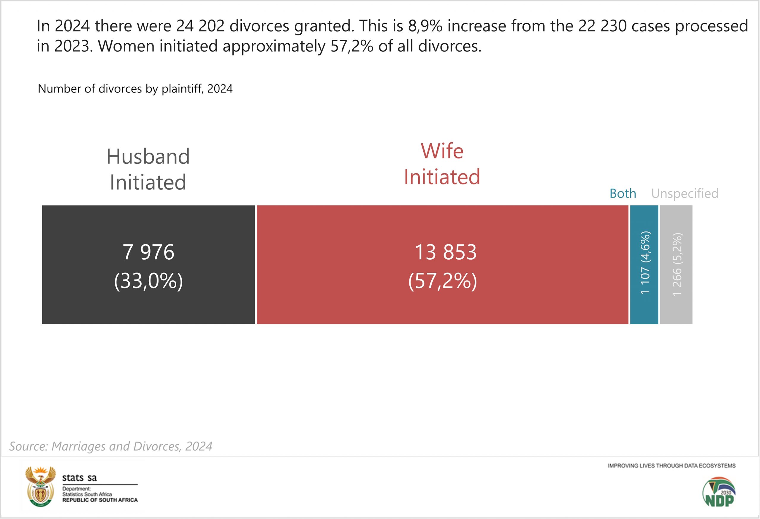 The new data shows a notable uptick in divorces and a clear trend: women are increasingly the ones initiating the end of the union. In 2024, a total of 24 202 divorces were granted across the country, an 8,9% increase from the 22 230 recorded in the previous year, signalling not only a rise in marital breakdowns but also deeper social changes within a constitutional democracy that has long championed gender equality. Within this growing number of cases, women remain the dominant initiators of divorce. According to the Marriages and Divorces 2024 report released by Statistics South Africa, wives filed for approximately 57,2% of all divorces granted in 2024. This trend, consistent in previous years, reflects a broader evolution in women’s autonomy and their access to legal avenues that protect their rights within marriage.