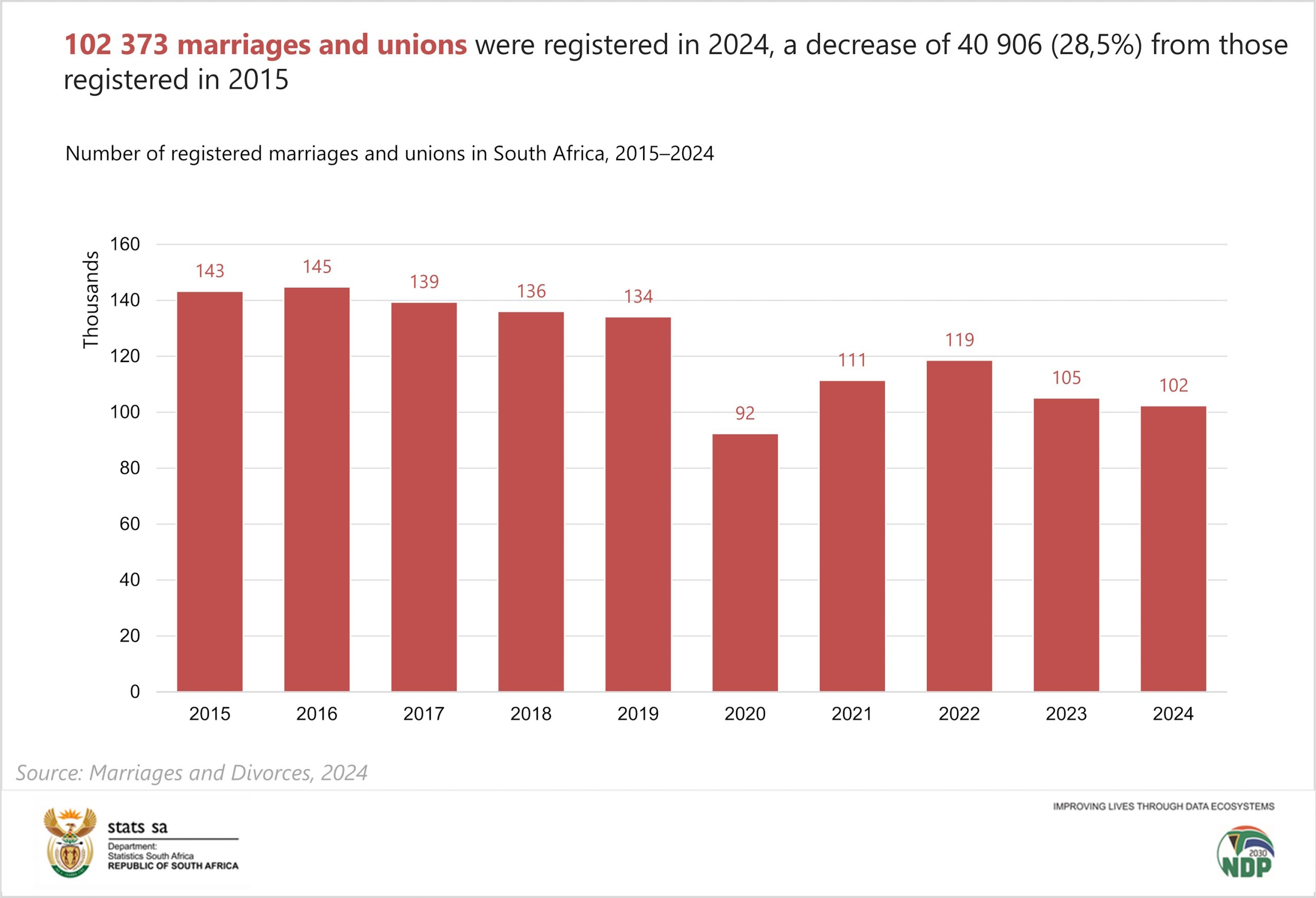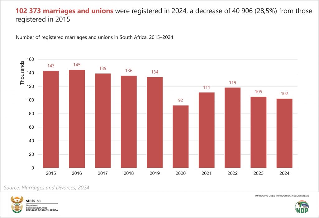 The country recorded 102 373 marriages and unions in 2024, marking a decrease of 2,6% from the 105 123 registered in 2023. More significantly, when compared to 2015, the decline becomes even more pronounced: marriages dropped by 40 906 over the decade, representing a 28,5% decrease. Civil marriages totalled 97 510 in 2024, which reflects a 1,8% decline from the 99 289 civil marriages registered in 2023. The data confirms a consistent downward trajectory in marriage registrations across the 10‑year period from 2015 to 2024, suggesting a structural and sustained shift in how South Africans approach long-term unions.