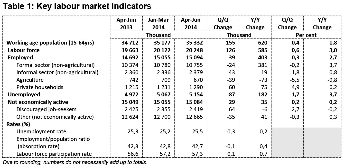 Employment increased by 39 000 between Q1: 2014 and Q2: 2014, while unemployment increased by 87 000 resulting in an increase of 126 000 persons in the labour force. Consequently, the unemployment rate increased by 0,3 of a percentage point to 25,5% in Q2: 2014. The expanded unemployment rate reached 35,6% in Q2: 2014, increasing by 0,5 of a percentage point between the first and second quarter of 2014.