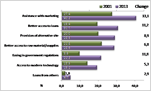 Figure 5: Type of assistance needed by informal businesses, 2001 and 2013
