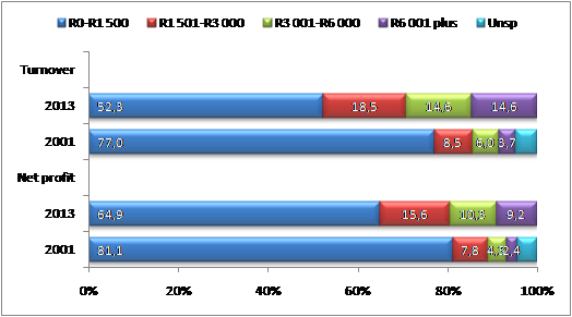 Assistance with marketing was the type of assistance most needed by people running informal businesses. The proportion needing this rose from 27,4% in 2001 to 40,5% in 2013. Turnover levels and profit margins are relatively small for most informal businesses. In 2013 as many as 52,3% had a turnover of R1 500 or below in the month prior to the survey and only 14,6% had sales above R6 000. Net profits for 64,9% of businesses were also low (at R1 500 or lower in the month prior to the survey) and only 9,2% of businesses made net profits above R6 000 (Figure 6).