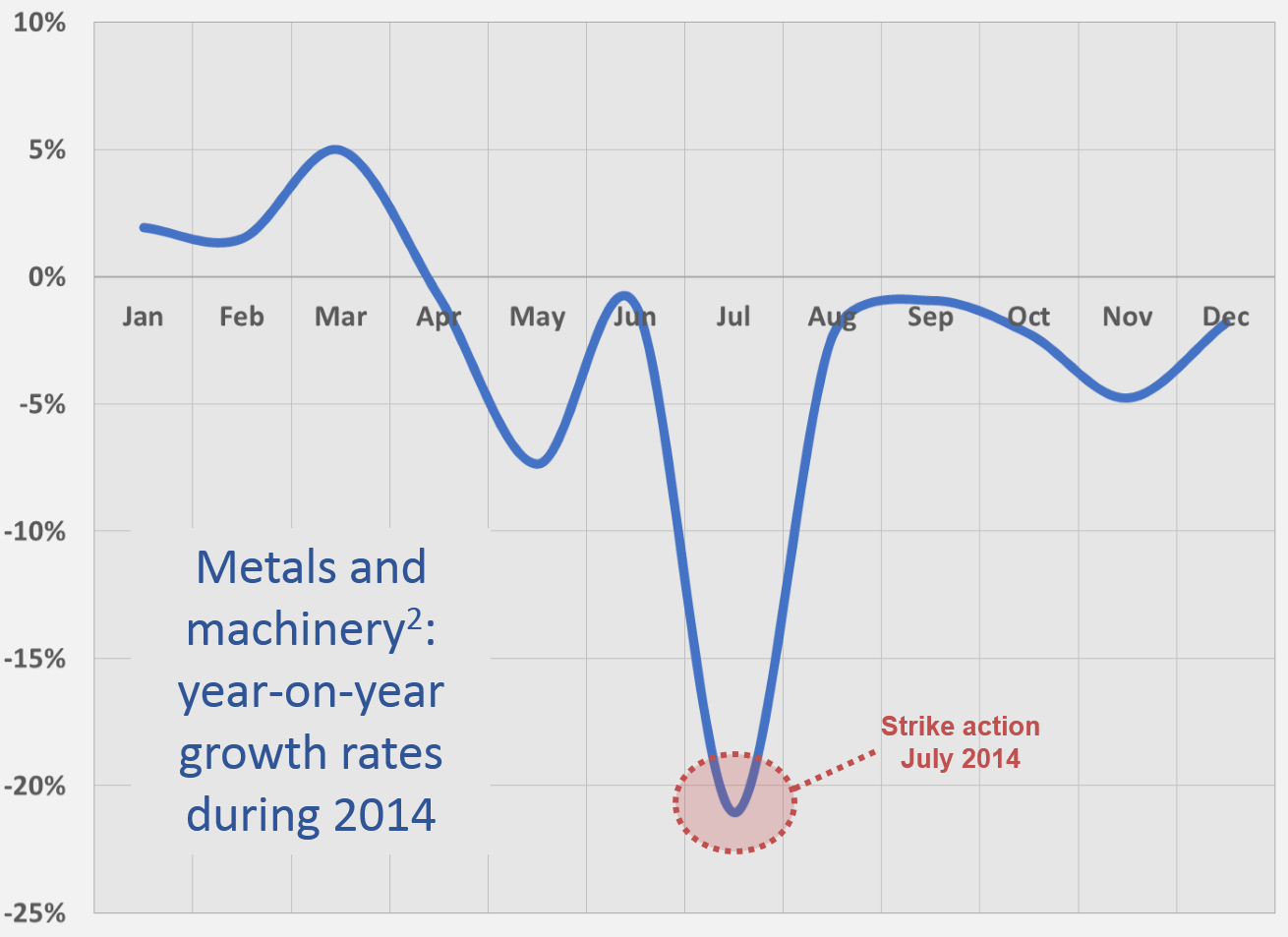 Metals & machinery fell by 3,0% in 2014 compared with 2013. Its annual growth rate (see graph) started the year in positive territory (January, February and March) but turned negative for the rest of the year, reaching a low of ‑21,2% year-on-year in July 2014 as a result of a four-week long metals and engineering strike.