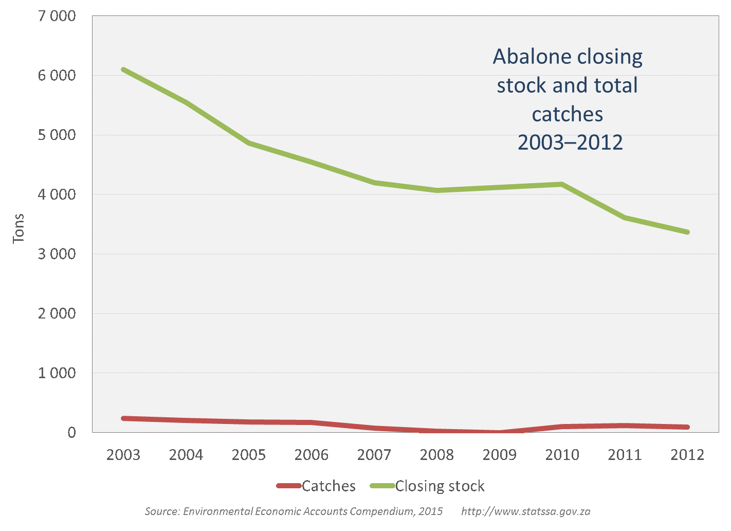 Measuring the stocks and depletion rates of scarce resources is important to ensure the drafting of effective environmental management policies. The closing stock for abalone decreased from 6 096 tons in 2003 to 3 364 tons in 2012, a drop of 44,8% over the ten-year period. Total catches for abalone declined by 59,4% from 234 tons in 2003 to 95 tons in 2012.