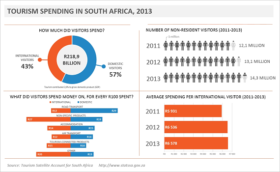 Domestic visitors contributed 57% (R124,7 billion) of total tourism spend in 2013, while international visitors contributed 43% (R94,2 billion). Total tourism spend in 2013 was R218,9 billion, a rise of 9,7% from R199,4 billion in 2012.
