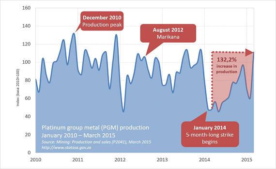 The 132,2% year-on-year rise in platinum group metal (PGM) production in March 2015 pushed overall mining production up by 18,8%, the second highest year-on-year increase since January 1980. It would be tempting to celebrate in response to the pronounced rise in PGM production, but a closer look at the data tells a more sober story.