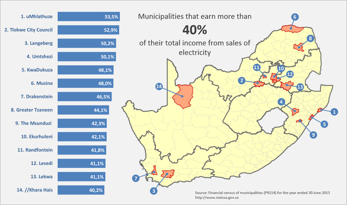 The map above can be refined further, highlighting those municipalities that earned more than 40% of their income from electricity sales in 2012/13. The number one spot is held by uMhlathuze (Empangeni and Richards Bay) with 53,5%. Tlokwe City Council, the Potchefstroom area, comes second (52,9%), followed by Langeberg (50,2%). One metropolitan council appears in the list: Ekurhuleni (42,1%), placed at number 10.