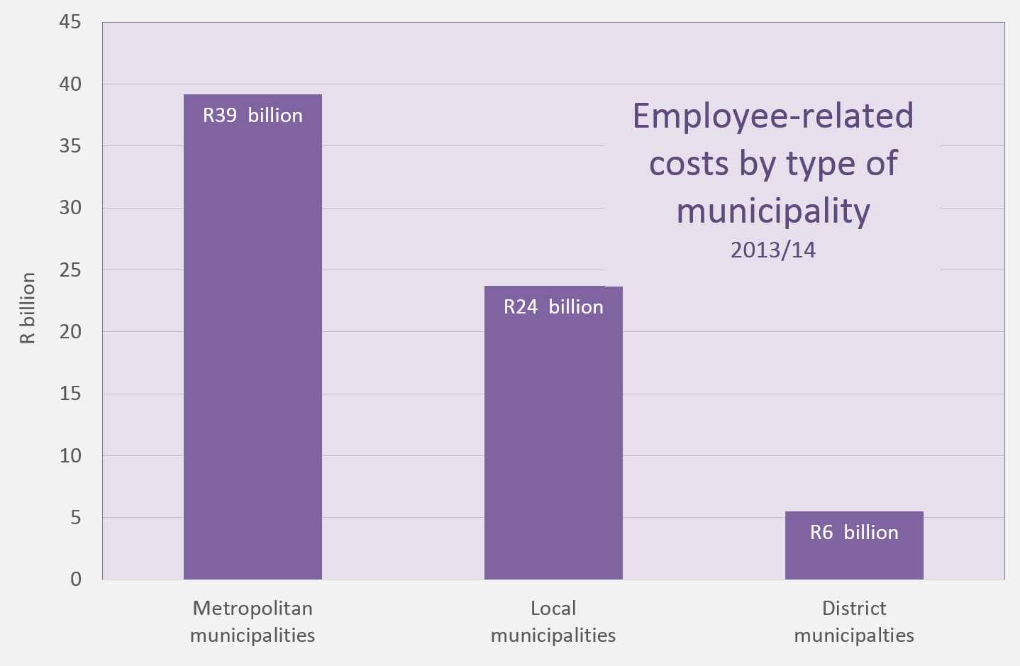 Metropolitan municipalities contributed 57,3% (R39 billion) of total municipal employee related costs in 2013/14. Local municipalities contributed 34,6% (R24 billion) and district municipalities 8,0% (R6 billion).