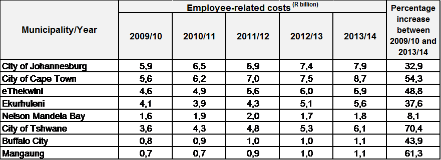 Employee-related costs increased by about R23 billion over a five year period, from R45,2 billion in 2009/10 to R68,4 billion in 2013/14. As a percentage of total municipal expenditure, employee-related costs contributed 26,1% in 2013/14.