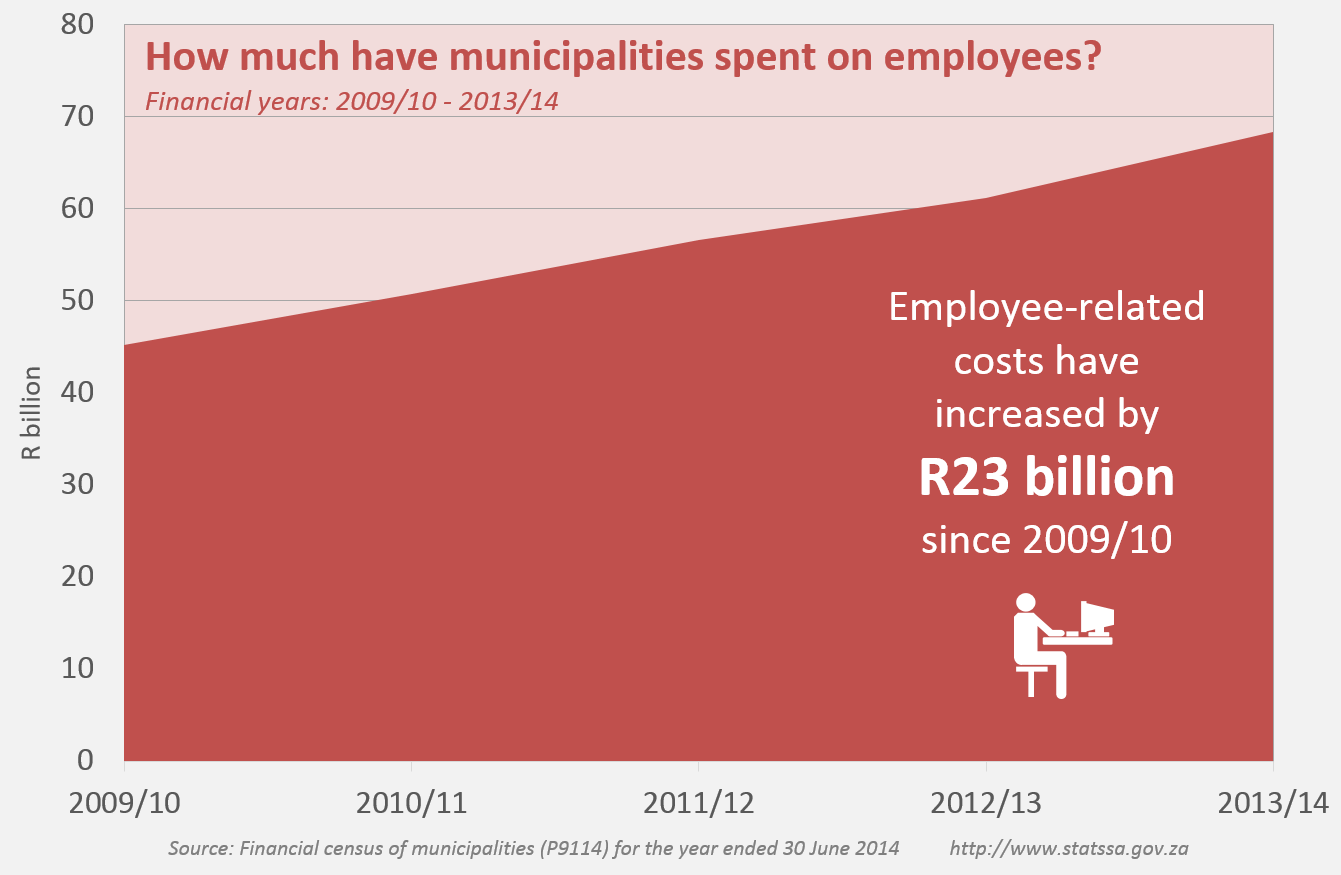 Employee-related costs of municipalities rose from R61,2 billion in 2012/13 to R68,4 billion in 2013/14, an rise of 11,6%. This is one of the findings from the latest Financial census of municipalities report published by Stats SA.