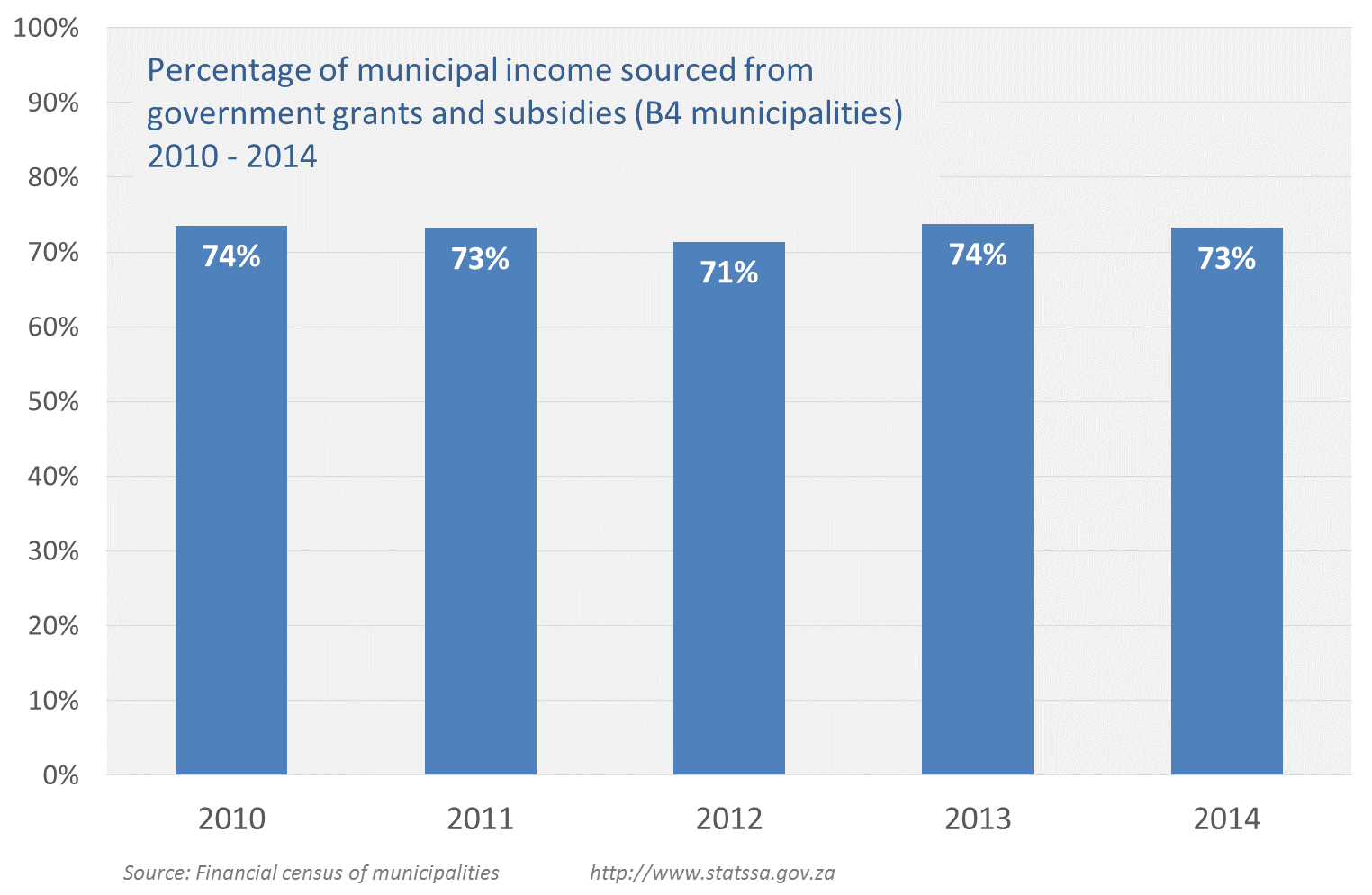 The chart below shows that the dependence of B4 municipalities on grants and subsidies has remained relatively stable. For every R1 that B4 municipalities received as revenue in 2010, 74c was from national and provincial government. This decreased slightly to 73c in 2014.