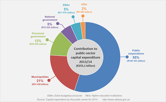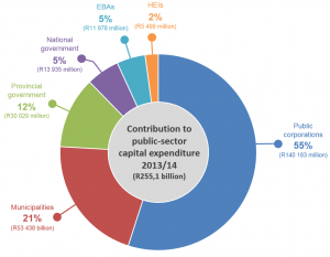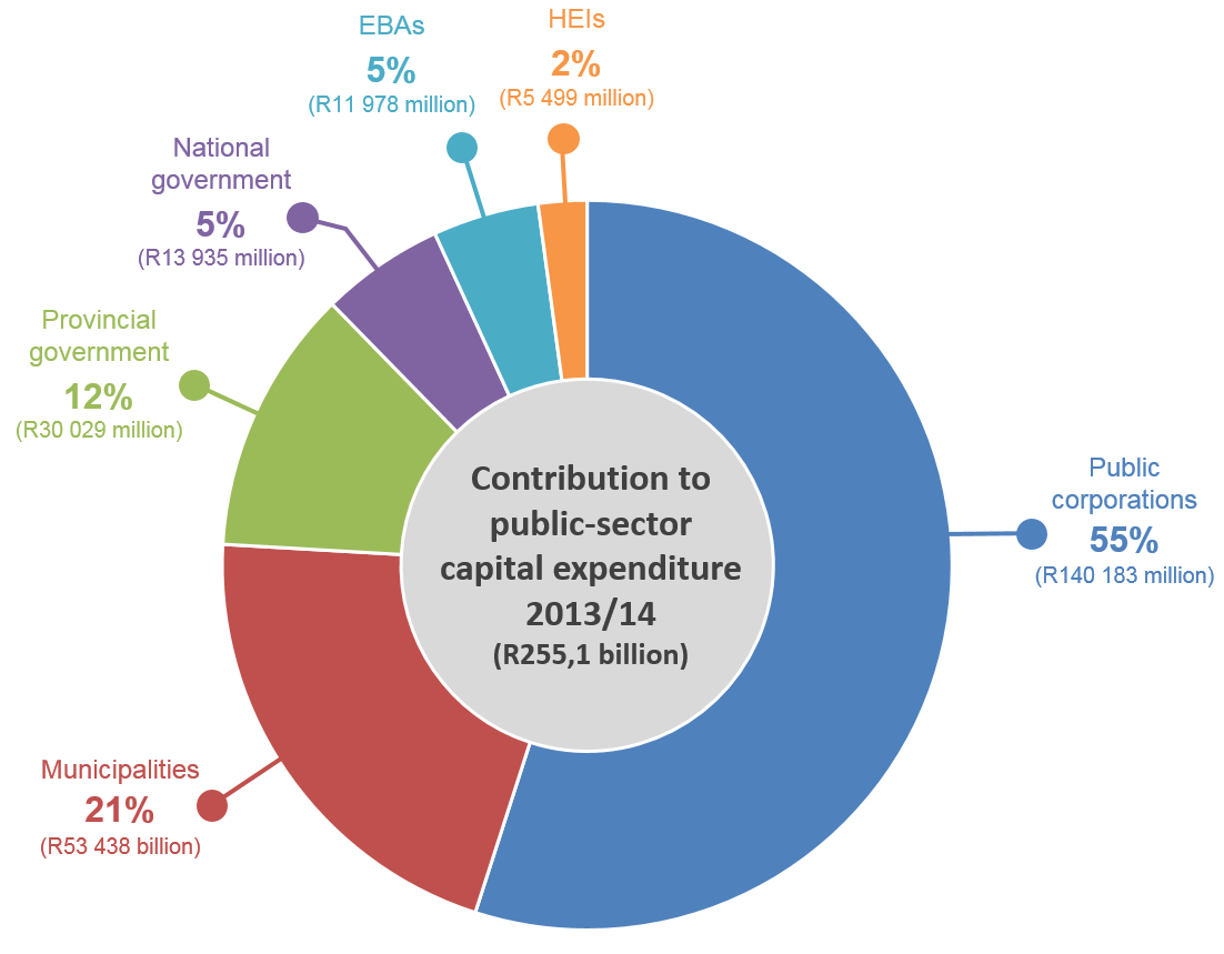 Public corporations reported the largest share of capital expenditure in the public sector (55%), followed by municipalities (21%), provincial government (12%), national government (5%), extra-budgetary accounts and funds (5%) and higher education institutions (2%).