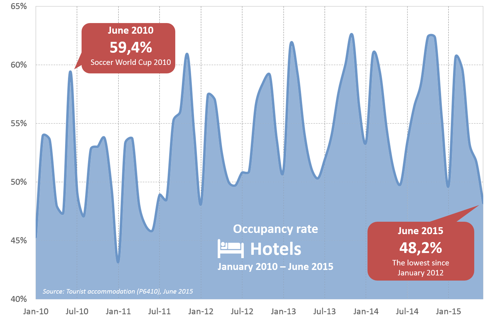Over the last four years hotels have experienced relatively high occupancy rates during peak months (October/November and February/March), often surpassing the 59,4% recorded during the 2010 Soccer World Cup. However, the rate recorded for June 2015 was the lowest since January 2012.