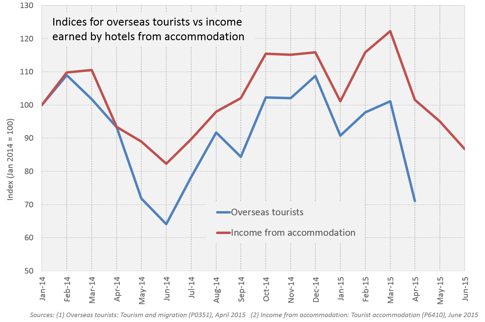 The chart below shows seasonal similarities between the number of overseas tourists and the amount of income earned by hotels from accommodation. Overseas tourist figures are not yet available for May and June 2015.