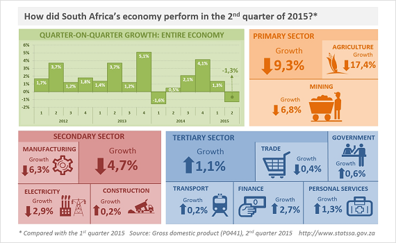 South Africa’s economy contracted by 1,3% (seasonally adjusted and annualised) in the second quarter of 2015, according to preliminary estimates of real gross domestic product (GDP) released by Stats SA.