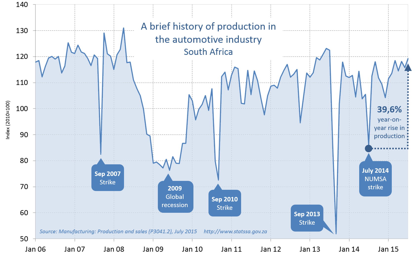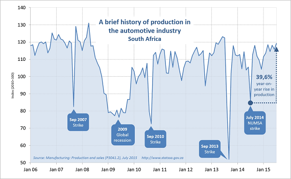 Manufacturing production increased by 5,6% year-on-year in July 2015, driven mostly by a 39,6% year-on-year production rise in the automotive industry and a 17,4% year-on-year rise in the metals and machinery industry. It would be tempting to rejoice in response to these pronounced increases, but the figures don’t tell the whole story.