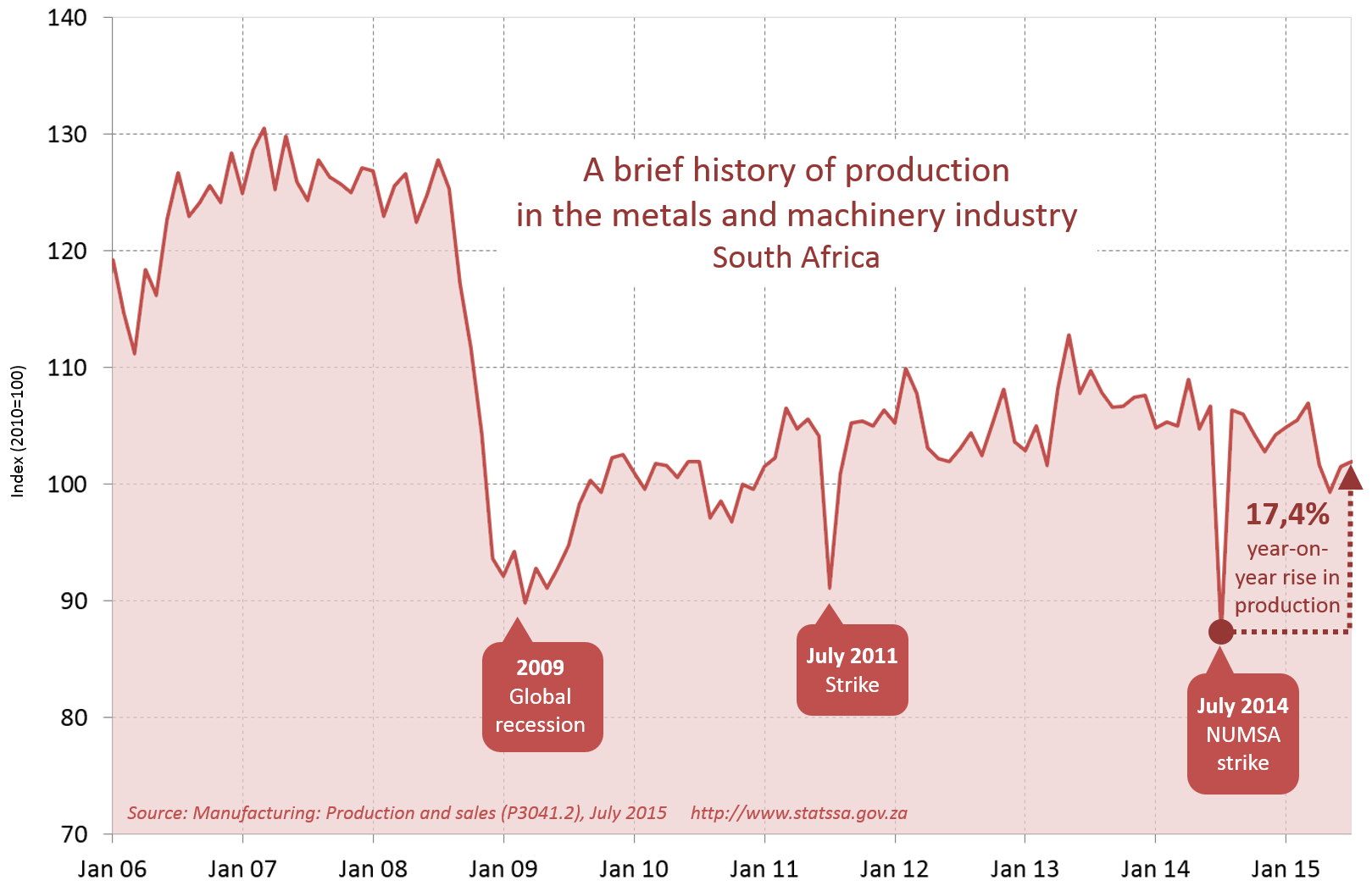 A base effect for output in the metals and machinery industry was also evident in July 2015 due to industrial action by NUMSA in 2014. Output slumped in July 2014, with a production index of 87,0, the lowest monthly production level on record (series starting in January 1998).
