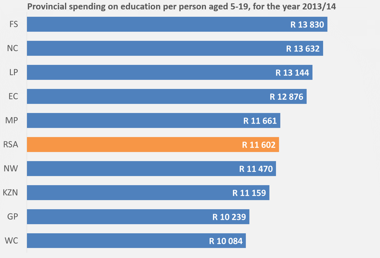 The bulk of provincial education expenditure is on pre-primary, primary and secondary education. Free State spent the most per person (aged 5 to 19) on education in 2013/14, namely R13 830. Western Cape spent the least, namely R10 084.2