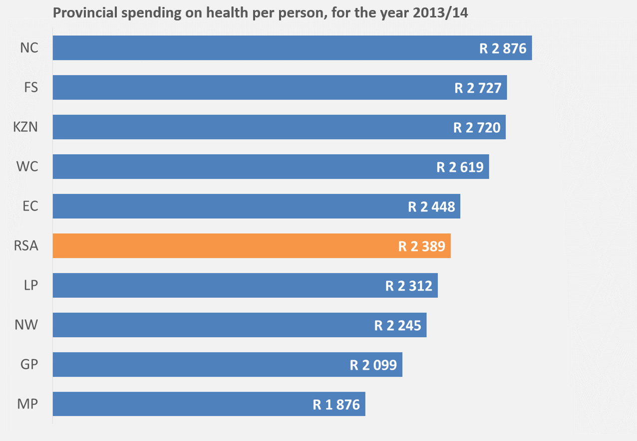 In terms of healthcare, which affects persons of all ages, Northern Cape again tops the list, having spent R2 876 per person in that province in 2013/14. Mpumalanga spent the least, at R1 876 per person.