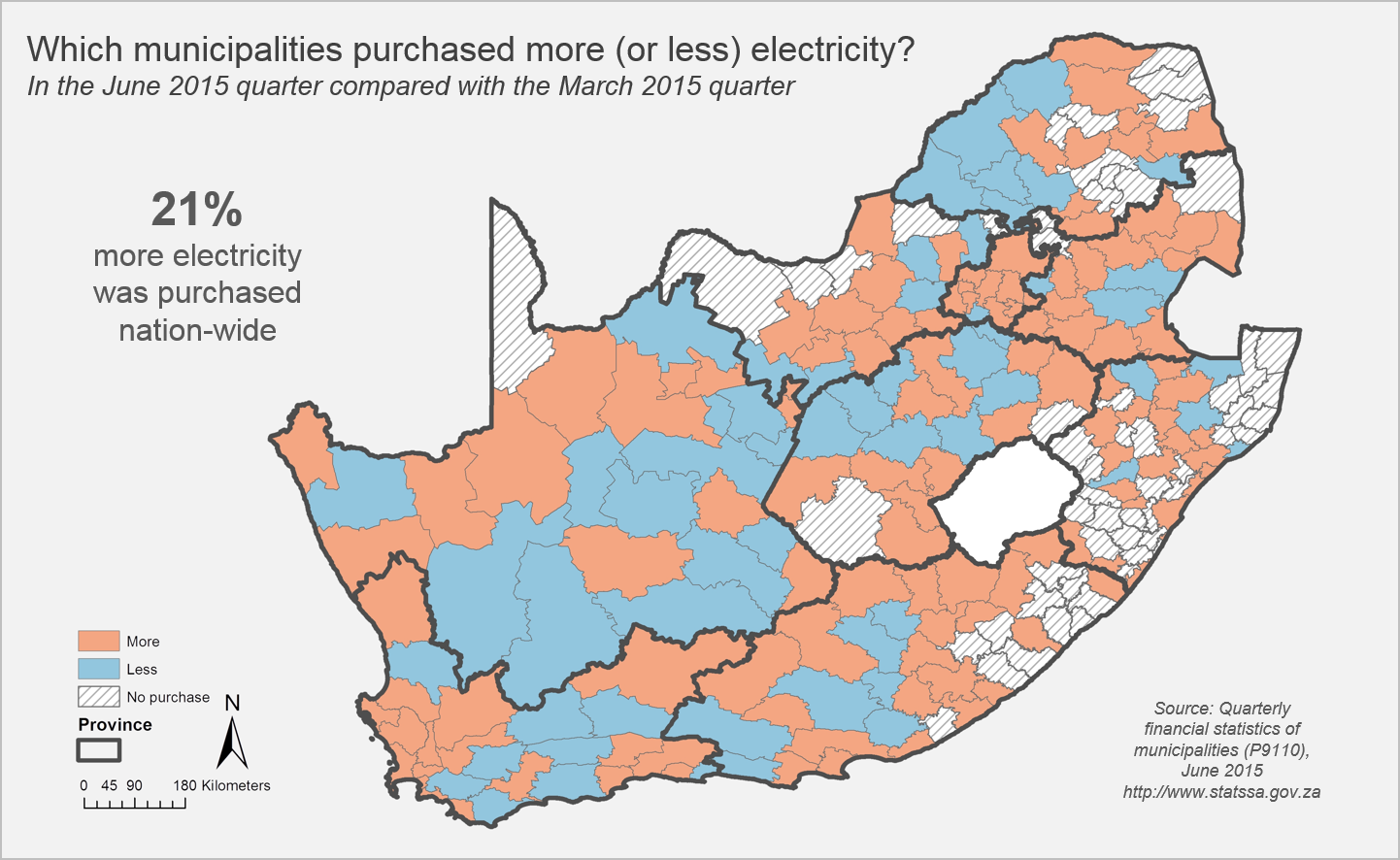Almost a third of income earned by municipalities (R21,9 billion) in the quarter ended June 2015 was through electricity sales, according to Stats SA’s latest Quarterly financial statistics of municipalities report2.