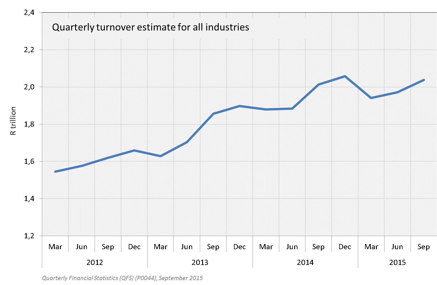 Stats SA’s latest Quarterly Financial Statistics report provides detailed financial statistics on the private sector, for the quarter ending September 2015. How did business turnover fare over this period? The following short article covers key turnover statistics from the report.
