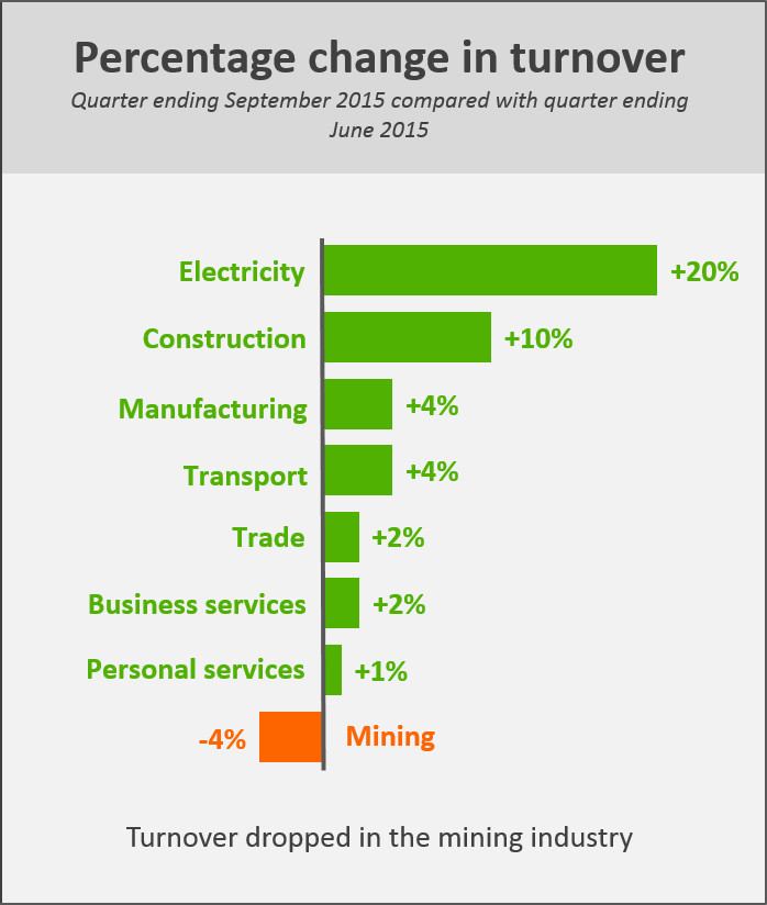 Turnover increased in seven of the eight industries between the June and September 2015 quarters. The largest percentage increase was recorded in the electricity, gas and water supply industry (+20%) (mostly seasonal), followed by construction (+10%) and manufacturing (+4%). Turnover decreased by 4% in the mining industry over the same period.
