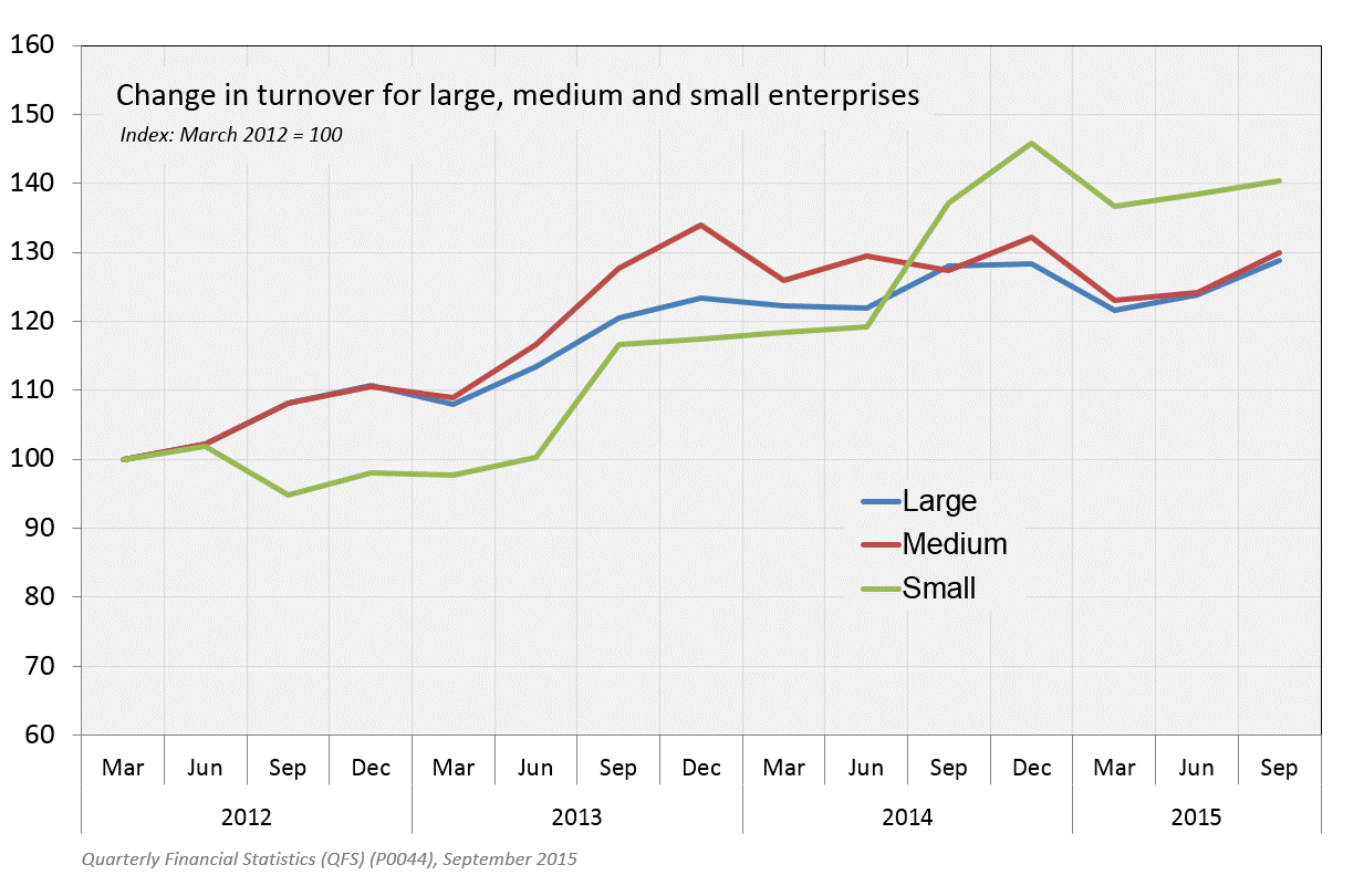 Broken down by enterprise size, large enterprises contributed 64% to total turnover in the September 2015 quarter, followed by small (27%) and medium enterprises (9%).