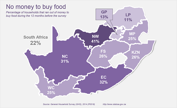 The data show that 22% of households in the country ran out of money to buy food some time during the 12 months prior to the survey4. The problem is particularly severe in North West (41%), Eastern Cape (32%) and Northern Cape (31%).