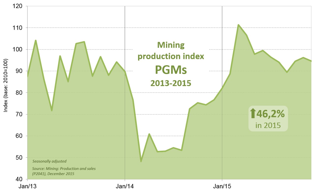 PGMs were the main contributor to the 3,5% rise in overall mining production. Of the four major minerals, the PGM group was the only one to record a production increase in 2015. The low base created in 2014 by the PGM miners’ strike saw PGMs performing strongly year-on-year in the first half of 2015, with production rising by 46,2% for the year as a whole.