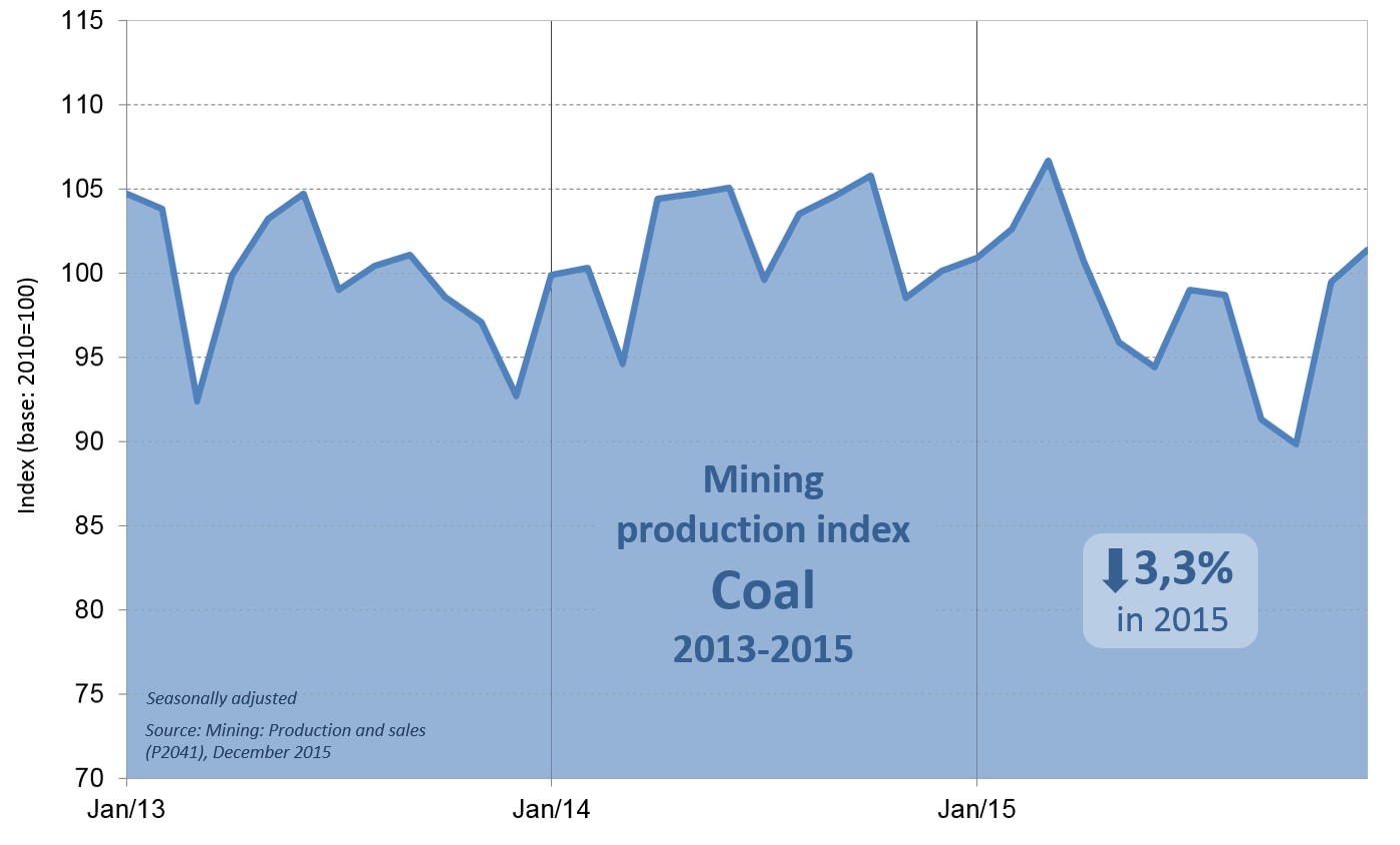 During the winter of 2015, coal production declined by 4,1% compared with 2014’s winter, in correspondence with a 2,9% fall in national electricity generation and a 2,3% fall in electricity consumed4. For the entire year of 2015, seasonally adjusted coal production fell by 3,3%.