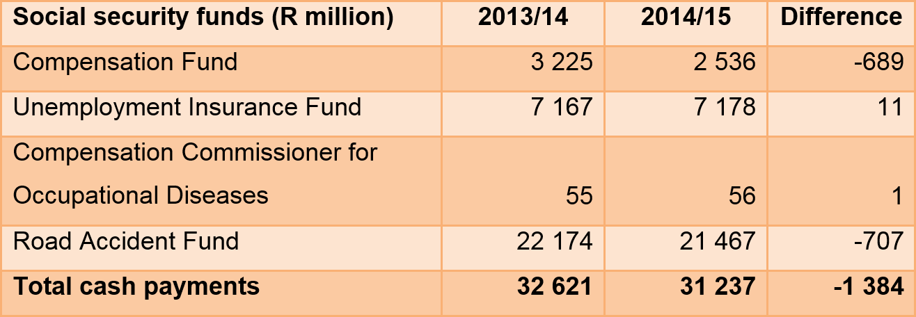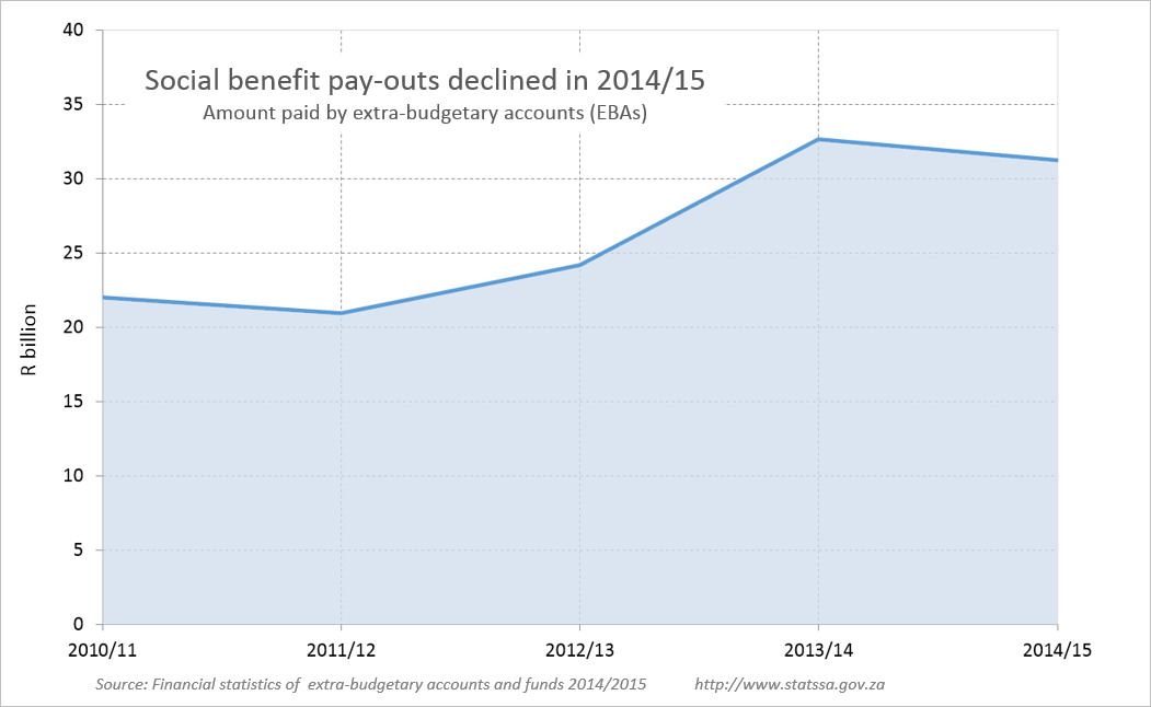 South Africa’s 232 extra-budgetary accounts (EBAs) paid out less money in the form of social benefits in the 2014/15 fiscal year. Social benefits are transfers in cash or in-kind to the public that diminishes exposure to social risks such as unemployment, sickness due to disabilities and injury.