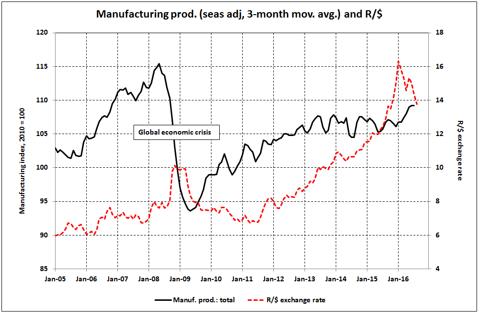 Manufacturing production grew by 0,3% in the first quarter of 2016 and by a further 2,1% in the second quarter (quarter-on-quarter, seasonally adjusted). Possibly some of this recovery was aided by rand weakness that occurred in 2015, but the bigger picture (Figure 5) does not suggest strong evidence of the manufacturing industry as a whole benefiting significantly from a weaker rand. The preliminary outcome for July 20164 shows a fall of 1,5% month-on-month in manufacturing production, and it should be noted that during February to August 2016 there was a substantial recovery in the rand.