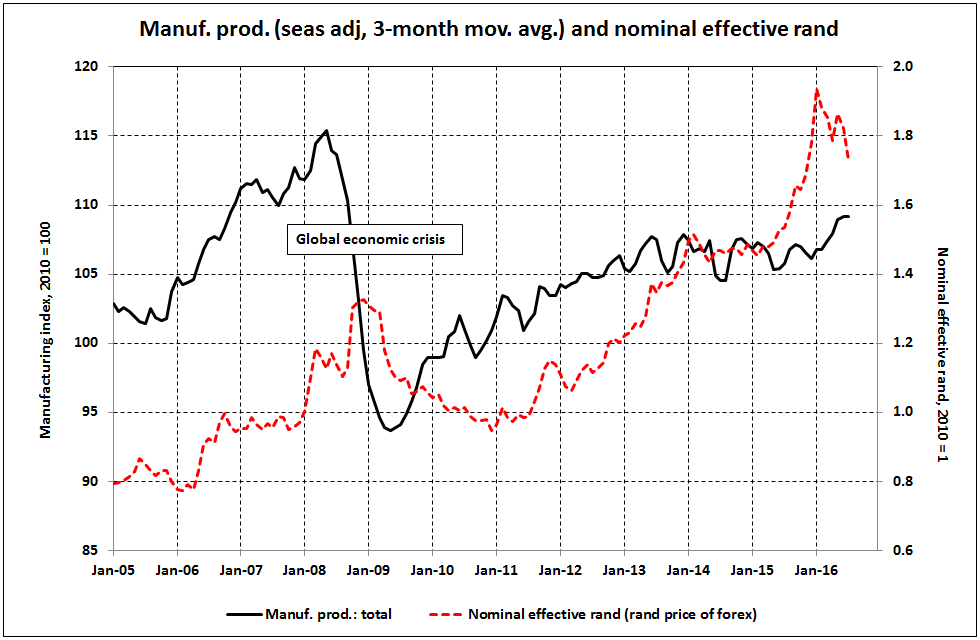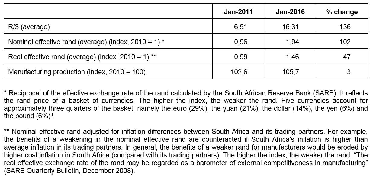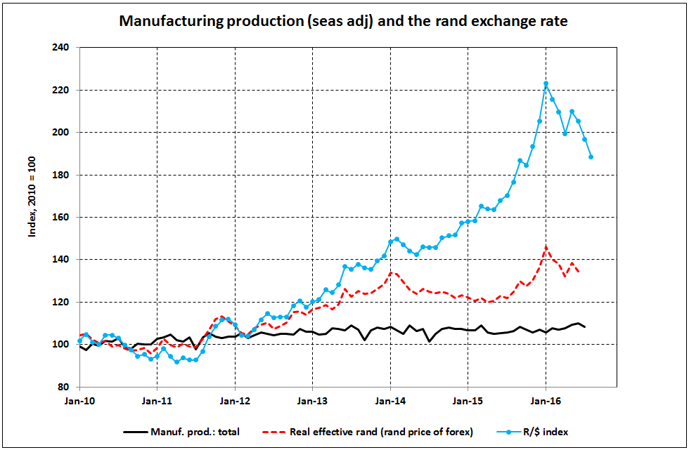 All three measures of the rand exchange rate show a much weaker rand between January 2011 and January 2016. The rand price of the dollar rose by 136%, and the rand price of the currency basket rose by 102%. Adjusted for inflation differences, the rand price of the basket rose by 47%. In contrast, manufacturing production rose by a mere 3%.