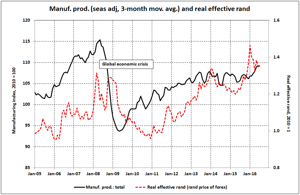 Figure 1 shows the severe impact of the global economic crisis of 2008/2009. Organisation for Economic Co-operation and Development (OECD) industrial production and South Africa’s manufacturing industry contracted sharply1. The subsequent recovery in South African manufacturing production has been insufficient for it to return to its pre-crisis level. In general, a strong global economy supports South African exports, and therefore economic growth, but during 2014 and 2015 OECD industrial production was generally flat, and on average for those two years growth in South African manufacturing was zero2.The flat performance of OECD industrial performance continued in the first half of 2016.