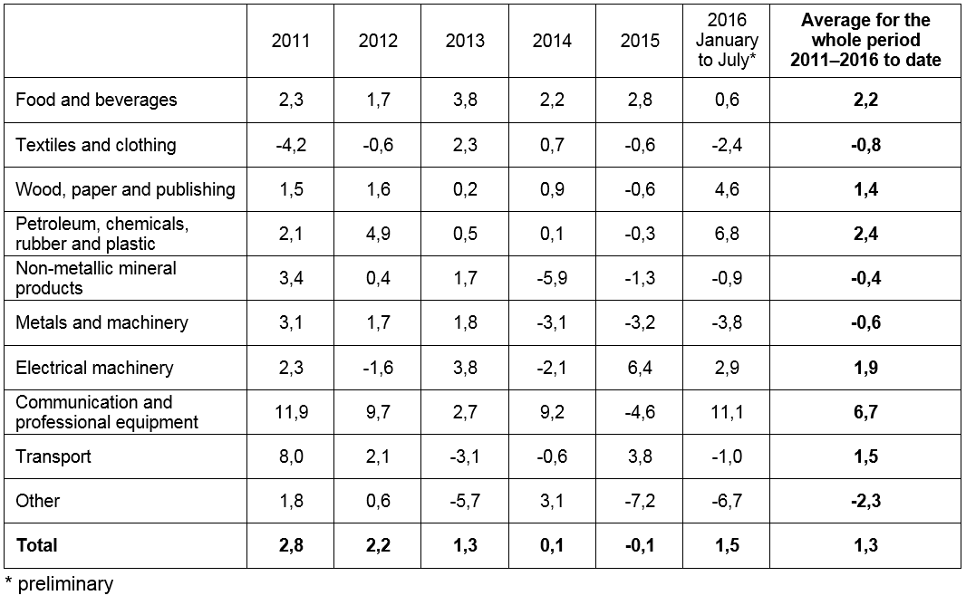 Table 2 provides an update of the 10 manufacturing divisions. Measured year-on-year, the performance was quite evenly mixed in the seven-month period January to July 2016, with five divisions showing positive growth and five divisions showing negative growth. The strongest performer was communication and professional equipment (11,1%), but that was more the consequence of a low base in 2015 than strong growth in 2016. Apart from the “other” division, the weakest performer was metals and machinery (‑3,8%).