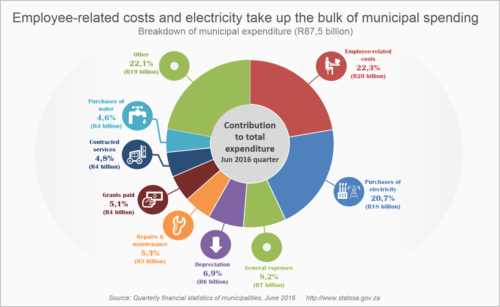 1 The Quarterly financial statistics of municipalities survey collects a range of financial data from municipalities. The report provides information on where municipalities source their income, and what they spend money on. The latest report provides data on the quarter ending June 2016 (i.e. the months of April, May and June). Download the report here.