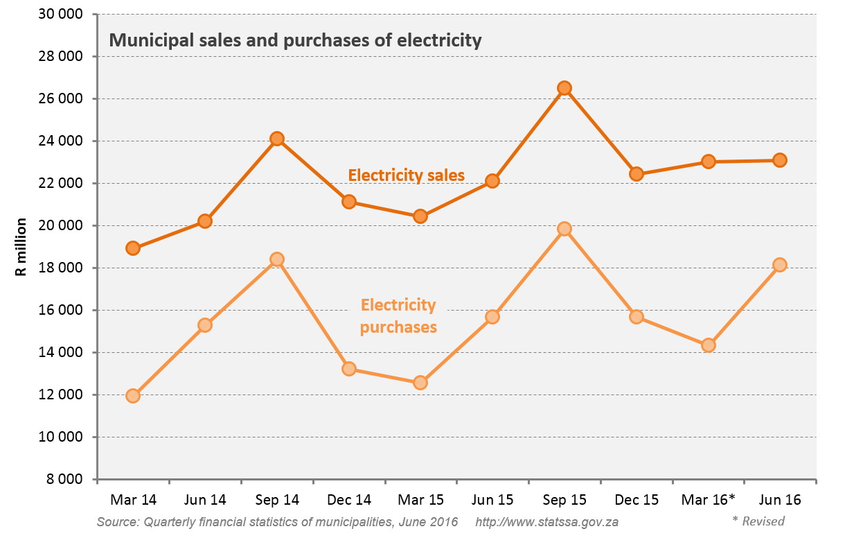 Total expenditure by municipalities increased by 21,9% (or R15,7 billion) in the June 2016 quarter compared with the March 2016 quarter, rising from R71,7 billion to R87,5 billion. Purchases of electricity by municipalities was one of the biggest contributors to this increase, according to Stats SA’s latest Quarterly financial statistics of municipalities report1.