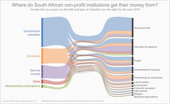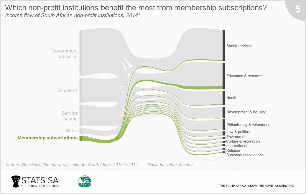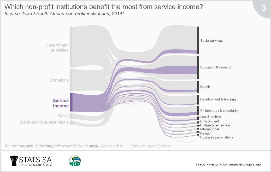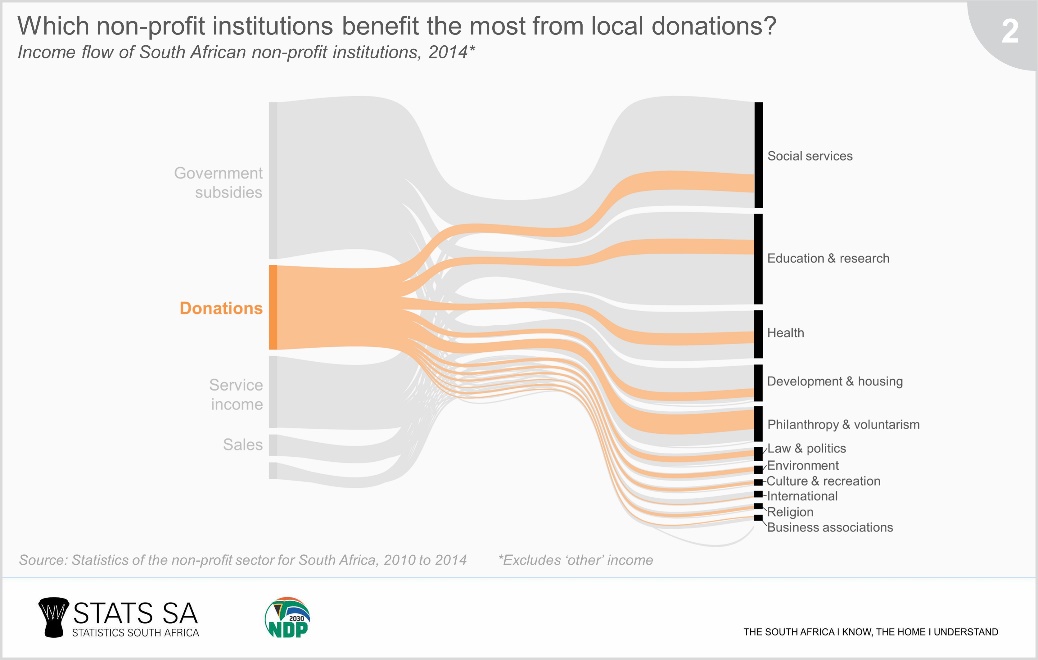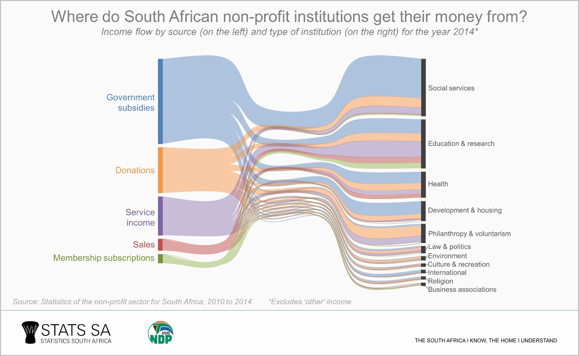 Some striking charts show how non-profit institutions (NPIs) in South Africa keep themselves afloat. Stats SA’s latest Statistics of the non-profit sector for South Africa report, released earlier this week, provides a range of data on the non-profit sector, including data on where NPIs source their income.