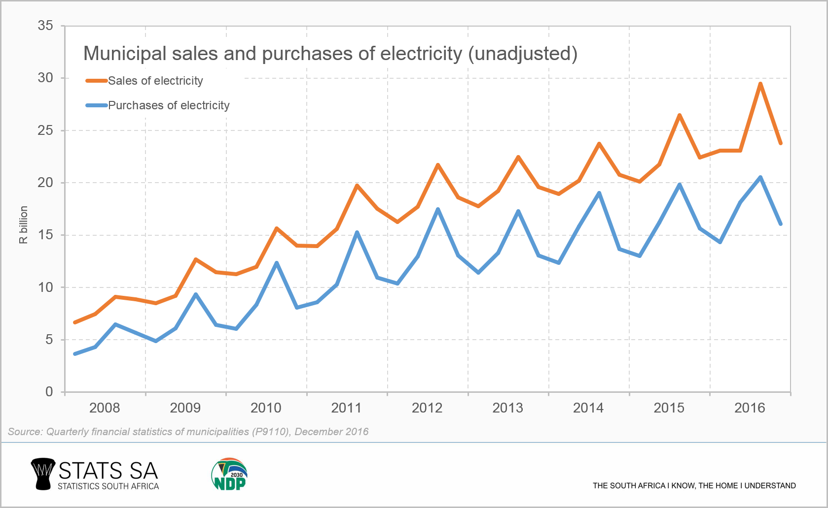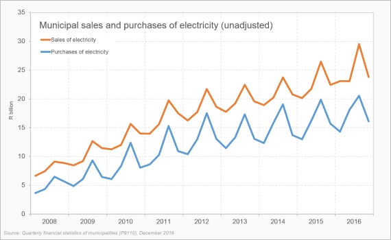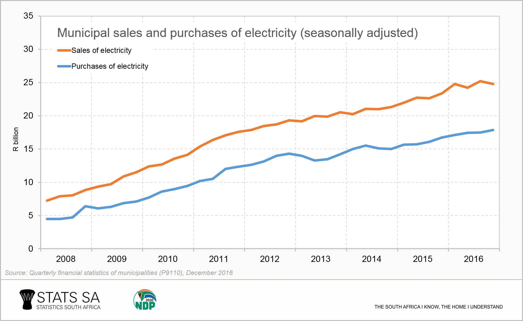 Consider the graph below, taken from the report, that plots the value of electricity bought and sold by municipalities over time1. Municipalities act as middle-men, buying electricity from Eskom in bulk and then re-selling it to residential, business and industrial customers.