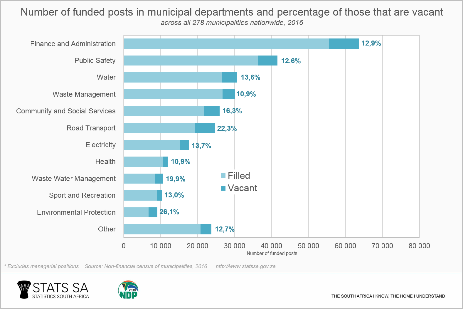 There were 314 117 funded posts across local government in 2016. Of these, 45 096 were unoccupied, translating to a national vacancy rate of 14,4%3.