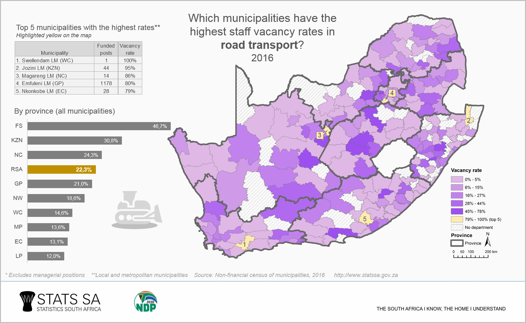 Other municipalities are not so lucky. Of the 24 655 road transport posts funded nationally in 2016, 5 487 (22,3%) were vacant. Almost half of available posts in road infrastructure departments were unfilled in Free State, with high vacancy rates recorded for Mangaung (74%) and Masilonyana (69%).