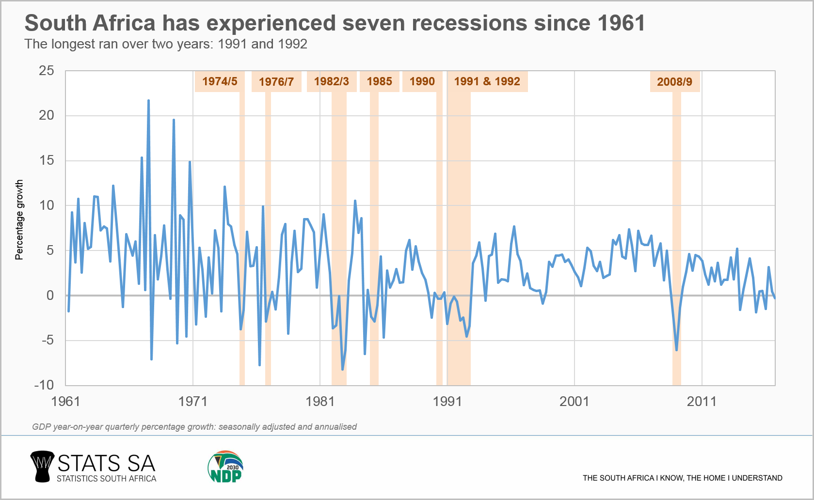 The generally agreed definition of recession is a fall in GDP (seasonally adjusted) for two consecutive quarters. Typically a decline in one quarter provides a low base, which is favourable for a positive rebound the following quarter; but if the following quarter sees a further dip instead of a rebound, it is a clear indication of distress. ‘Recession’ comes from the Latin ‘recedere’, to recede or go backwards. Figure 1 shows the relevant time-series for South Africa from 1961.