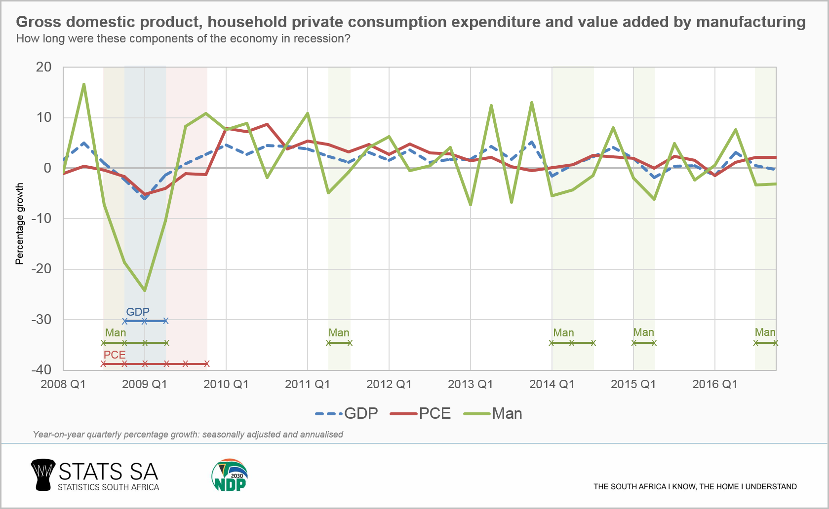 The different components of GDP can also be seen to be in recession or not. This could be the value added originating from a particular industry, or a component of final demand. The agriculture industry is prone to being in recession, given the impact that the weather can have on its performance. In Figure 2, the growth rates in private consumption expenditure by households, the value added by the manufacturing industry as well as total GDP are compared from 2008 to date.
