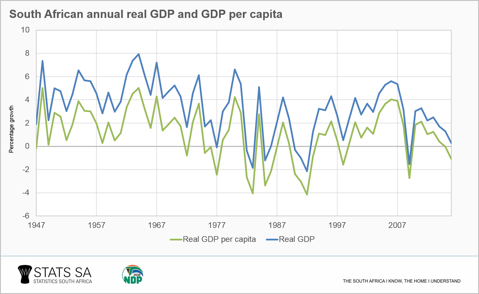 From Figure 3 we see that in all cases when annual GDP was negative, the GDP per capita followed suit. However, in a number of cases, weak (but positive) GDP translates into negative GDP per capita growth. The most recent example was in 1998, when GDP grew at 0,5%, but GDP per capita was -1,6%. More recently, the graph shows that in 2015 and 2016 the annual GDP rates of 1,3% and 0,3% became 0% and -1,1% in per capita terms, respectively.